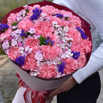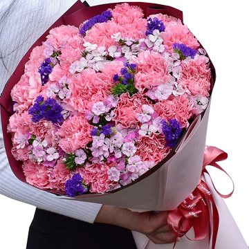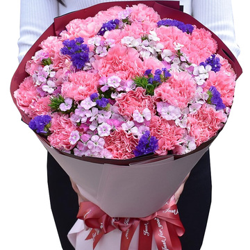 21朵粉色康乃馨,粉色石竹梅丰满间插,勿忘我点缀