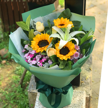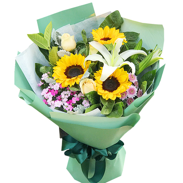 3朵香槟玫瑰,3朵向日葵,1枝多头白百合,粉色雏菊适量,粉色相思梅搭配,栀子叶丰满