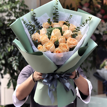 21朵香槟玫瑰,尤加利叶(或栀子叶)间插,巴西叶点缀
