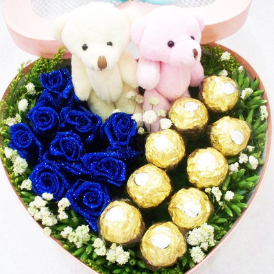 9朵蓝色妖姬,10个巧克力,一对可爱情侣小熊。