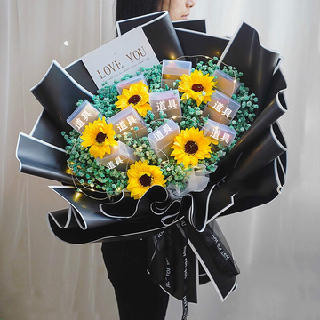 黑色欧雅纸包装,缎带束扎花语:让我的祝福随你,像潺潺的流水,延绵不断,欢乐如斯附送: