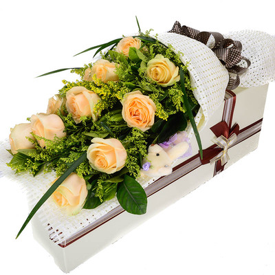11枝优质香槟玫瑰,绿叶、加拿大黄莺间插,青草外围,青草衬底,随机赠送一只可爱小公仔
