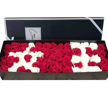 66朵混色(红、白)玫瑰,用白玫瑰拼字“女王”,其余用红玫瑰围边