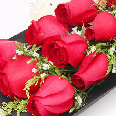 11朵红玫瑰,一对小熊,搭配相思梅、黄莺。