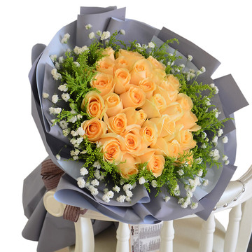 33朵香槟玫瑰,黄莺围边,满天星围边