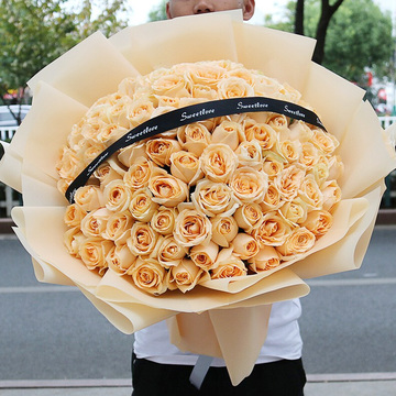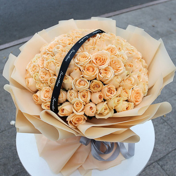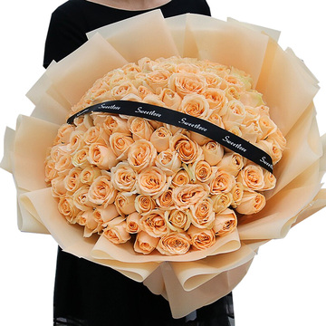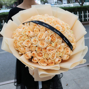 香槟色韩素纸叠层圆形包装,灰色缎带束扎花语:我对你的爱是香槟色,没有阳光刺眼,却充满温暖,在温情的日子里涅盘成诗附送: