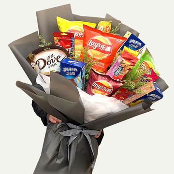 乐事薯片、德芙小巧粒、奥利奥巧心结、沙琪玛、彩虹糖、饼干等13袋零食,黄莺间插