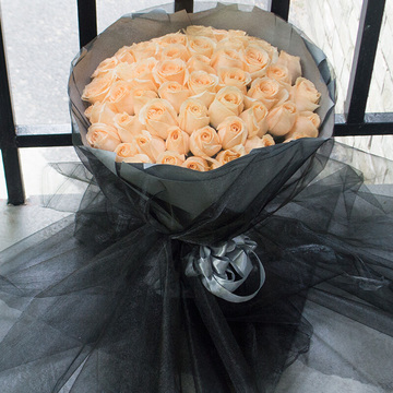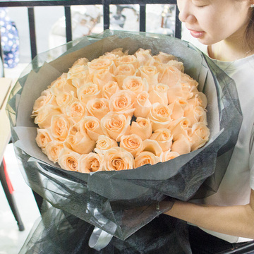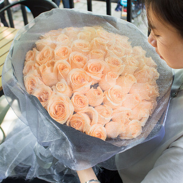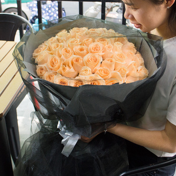 灰色卡纸精美包装,配银色缎带系结束扎,搭配黑纱外罩。花语:用心体会,让爱包围,柔情似水的你,像潮水一样将我包围,我会用真心好好爱你一生。附送: