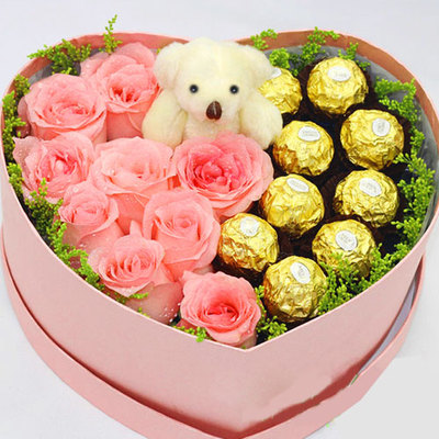 精选9朵戴安娜玫瑰+9颗费列罗巧克力+精美小熊一只,配黄莺适量。