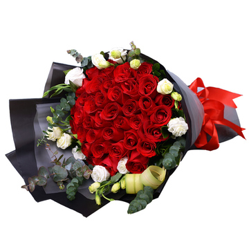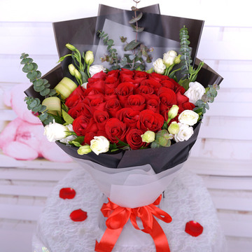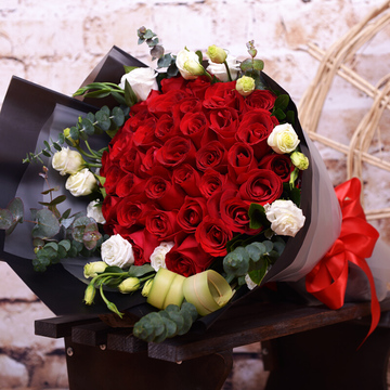 33朵红玫瑰,桔梗尤加利点缀。