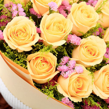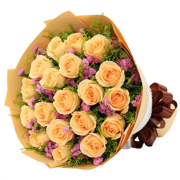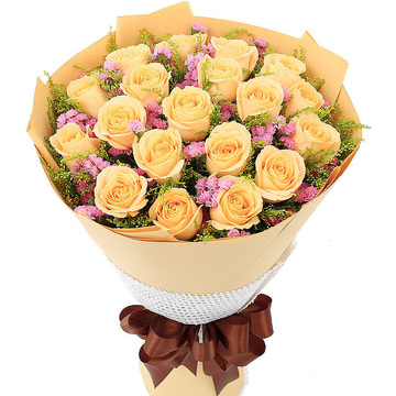 19支精品香槟玫瑰,搭配适量粉色勿忘我、黄莺间插