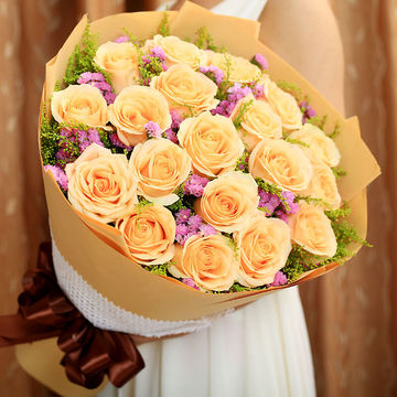 牛皮纸包装,深咖色缎带蝴蝶结束扎花语:每次相约都如此美丽,化为我永存的记忆。附送: