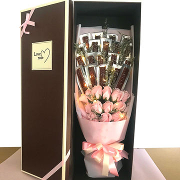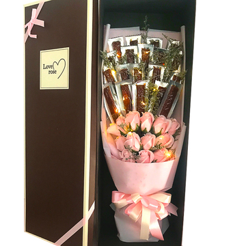12朵戴安娜粉玫瑰,19根卫龙辣条,黄莺间插,彩灯一条