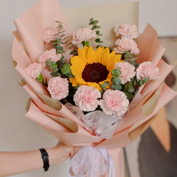 11枝粉色康乃馨,1朵向日葵,尤加利间插