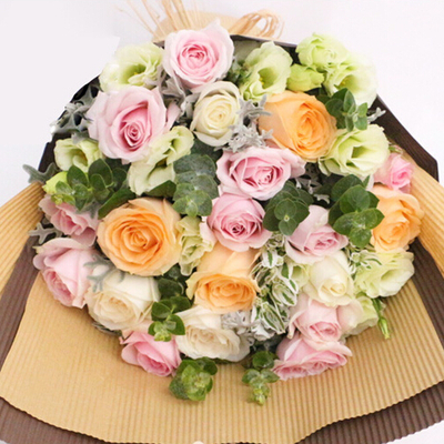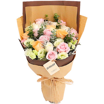 11枝精品戴安娜玫瑰,4枝香槟玫瑰,4枝白玫瑰,桔梗和尤加利间插。