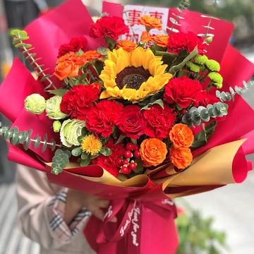 8支红康,2朵红玫瑰,1支向日葵,2支绿桔梗,5支橙芭比,绿色小菊、红豆、尤加利搭配