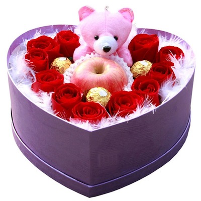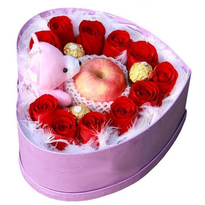 11朵精品红玫瑰,3颗费列罗巧克力,一个苹果,随机赠送一只小熊,羽毛围绕点缀