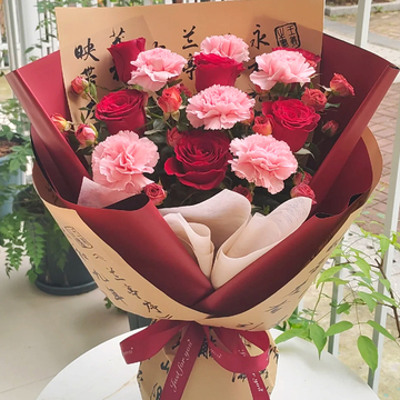 6朵粉康,6朵红玫瑰,橙芭比泡泡搭配,尤加利间插