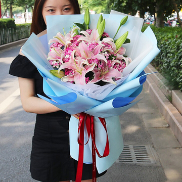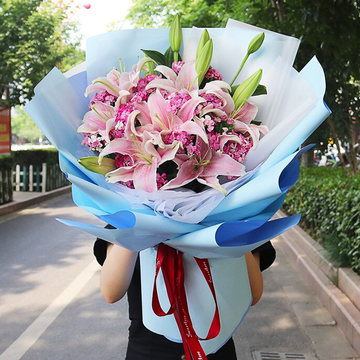 内衬白色雾面纸,外层蓝色欧雅纸层次扇形包装,酒红色缎带束扎花语:愿我的祝福像朵小花,永远盛开在你的梦里,时时刻刻让你好心情。附送: