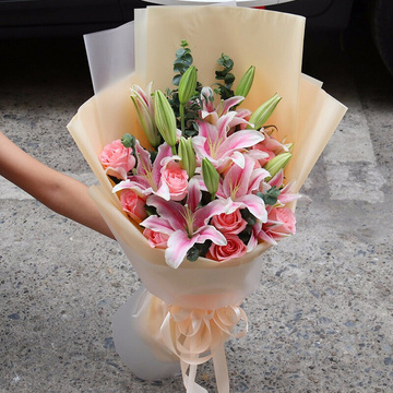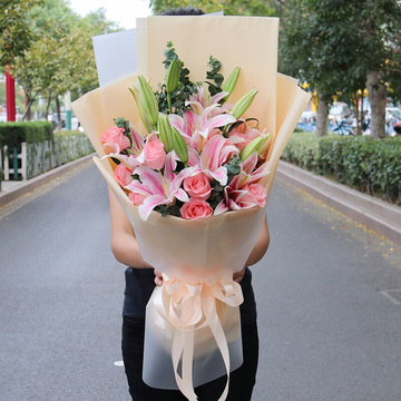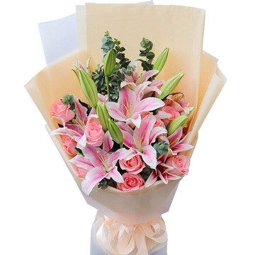 11朵戴安娜玫瑰,3枝多头粉百合,尤加利叶搭配