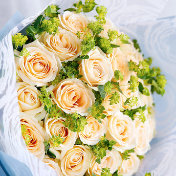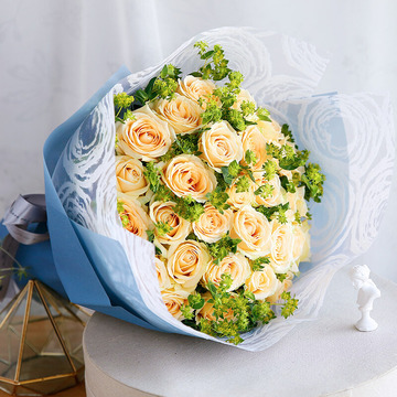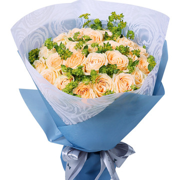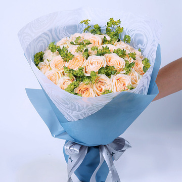 33朵香槟玫瑰,叶上黄金(或黄莺)搭配。