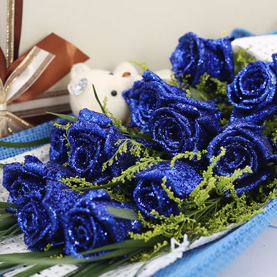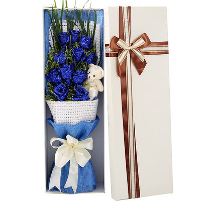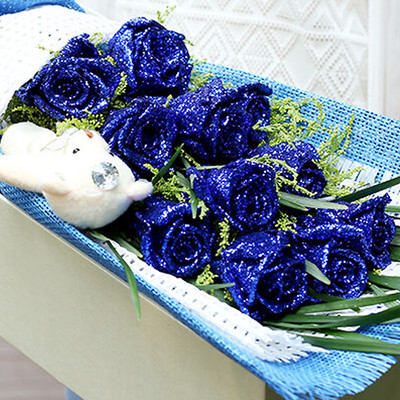 11支精品蓝色妖姬,搭配丝带草、黄莺,1只可爱小熊。