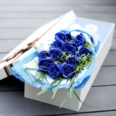 长方形礼盒包装。花语:就在你等待我的那个驿站,我早已许下了一个美好的心愿,我一定要等你到雨晴天蓝,与你相知相守。附送:
