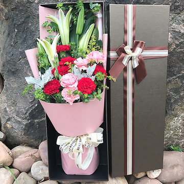6朵红康5朵粉康,2枝多头白百合,黄英间插,银叶菊搭配。