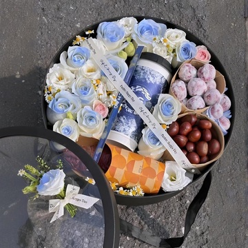 11朵碎冰蓝玫瑰,洋桔梗,绿叶,红薯、板栗、奶茶、糖炒山楂等搭配