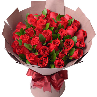 高档咖啡色牛皮纸圆形包装,红色丝带蝴蝶结束扎。花语:爱你每一天。附送: