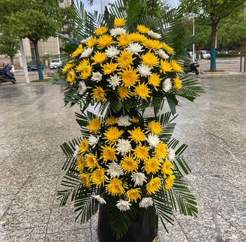 双层祭奠花篮,单个约70支黄白菊,散尾叶等配叶装饰