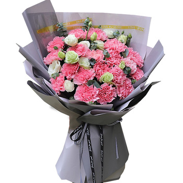 19支粉色康乃馨,3枝多头白桔梗间插,尤加利点缀