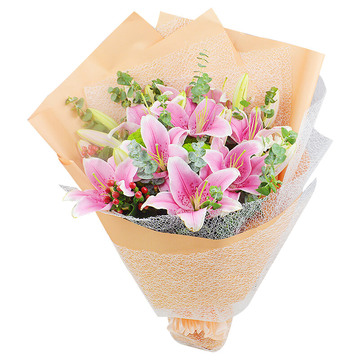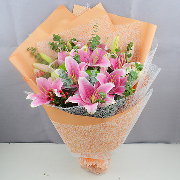 6枝粉色香水百合,搭配尤加利叶、红豆。