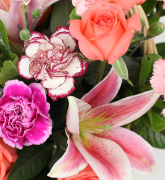 粉香水百合1枝,粉玫瑰8枝,粉康+紫康+紫边康乃馨间插,巴西叶和其他绿叶适量;橙子3个,红富士苹果3个,红提1斤。