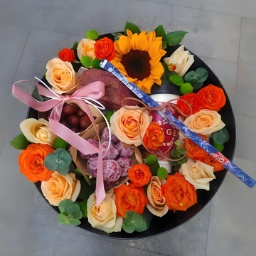 10朵香槟玫瑰,1支向日葵,红色多头玫瑰,绿叶,红薯、板栗、奶茶、糖炒山楂等搭配
