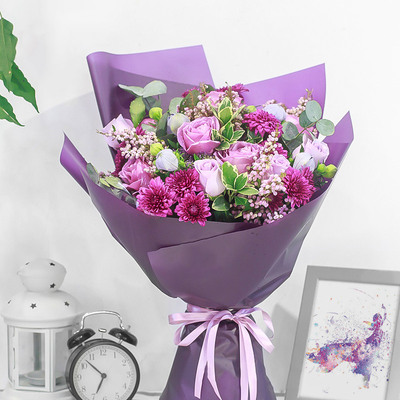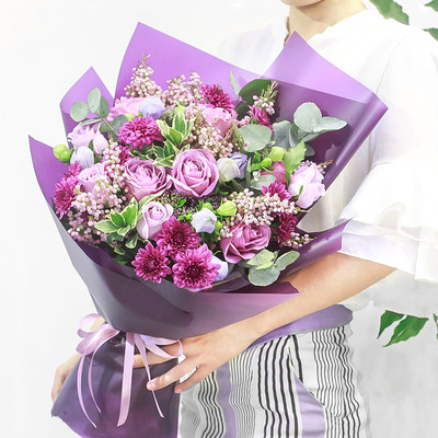 暗紫色雾面纸包装配粉色缎带系结束扎。花语:我天天吃大米,心里想的都是你!我从来不吃面,每天想见你一面!我一餐不喝汤,见不到你我心慌!我光喝酒不吃菜,今生今世把你赖!附送: