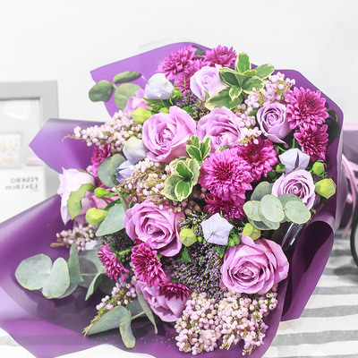 11朵紫玫瑰,10朵紫色小雏菊,尤加利,高山积雪等搭配。