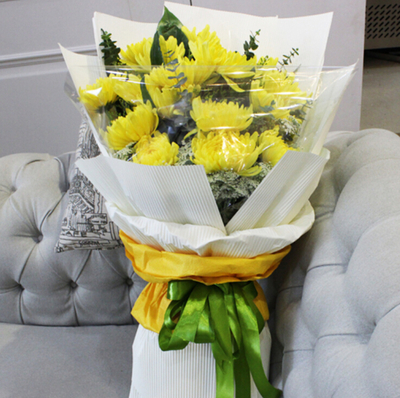 白色精美包装纸黄色束腰绿色缎带法式蝴蝶结束扎花语:祭祀扫墓花束附送: