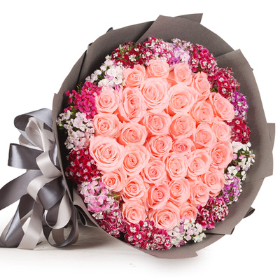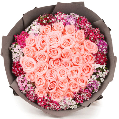 精选33支戴安娜粉玫瑰,相思梅围边。