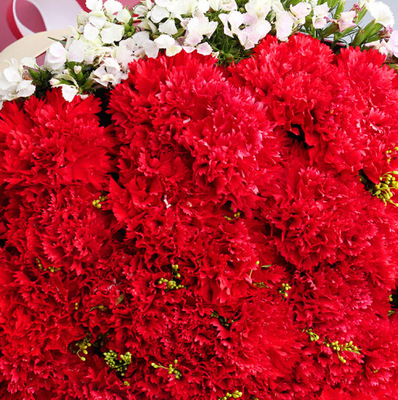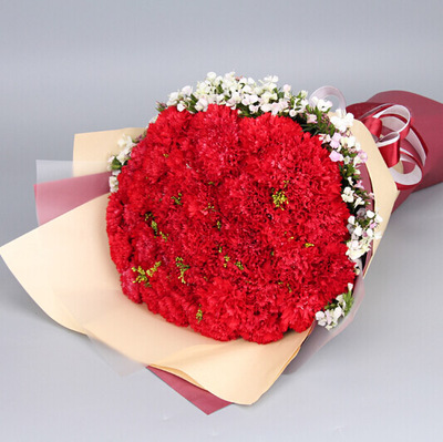 33朵红色康乃馨,相思梅、黄莺丰满搭配。