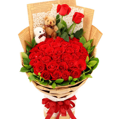 33朵精品红玫瑰,外围橘子叶,两只可爱小熊