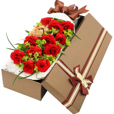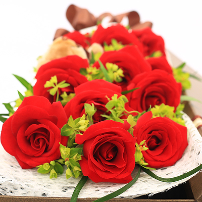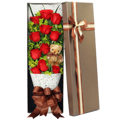 11朵红玫瑰+小熊,叶上黄金或黄莺间插,丝带草点缀