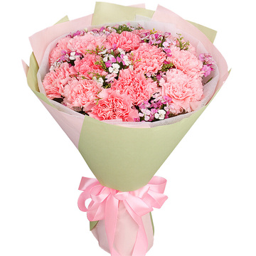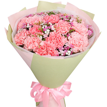 19朵粉色康乃馨,粉色石竹梅丰满间插,黄莺点缀