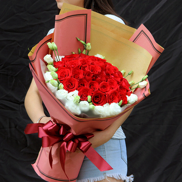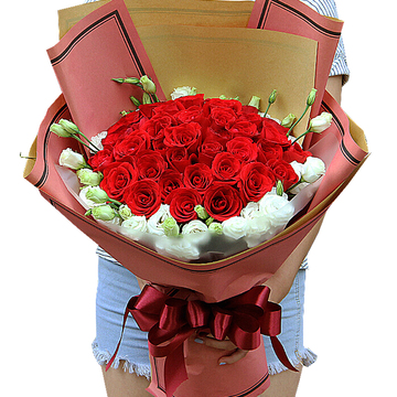 砖红色卡纸扇形包装,酒红色丝带系蝴蝶结。花语:陷入爱情的我不知道疲惫为何物,心中款款柔情只对你一个人诉说。附送: