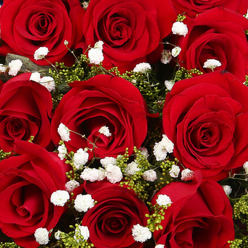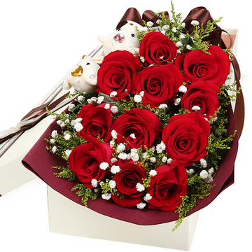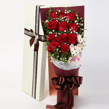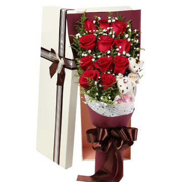 11朵精品红玫瑰,满天星点缀,黄莺间插,搭配2只可爱小熊。