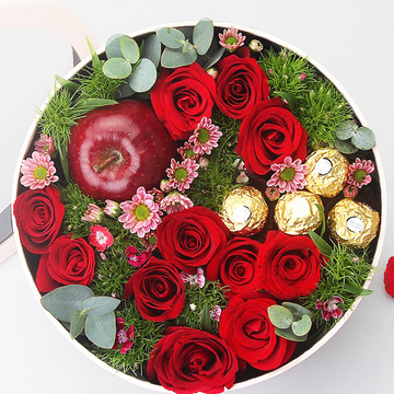 11朵红玫瑰+1个蛇果+4颗巧克力,小雏菊、松枝搭配(节日如没有蛇果用苹果代替)