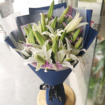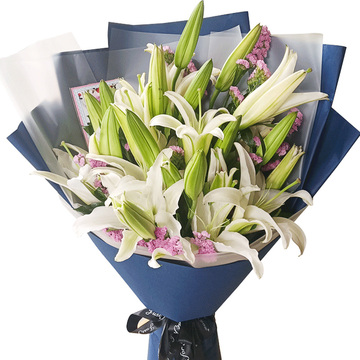 8枝多头白百合,搭配粉色勿忘我或粉色相思梅,绿叶