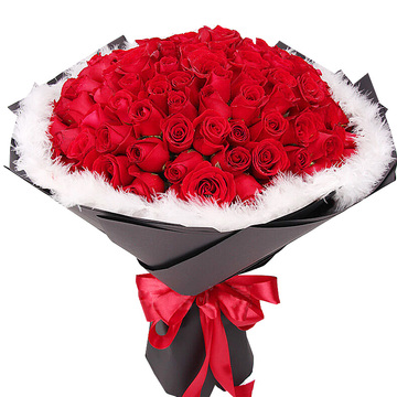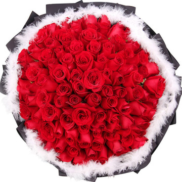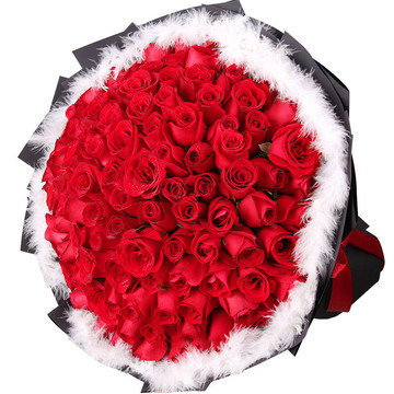精选99朵红玫瑰,羽毛围绕。