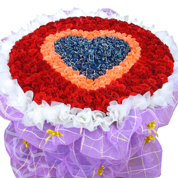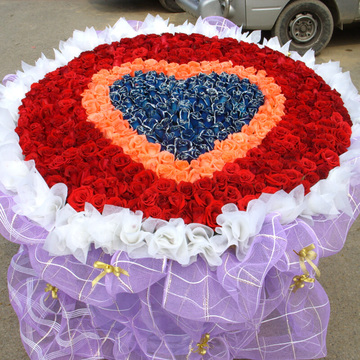 红玫瑰、艳粉玫瑰、蓝色妖姬一共520朵,艳粉及颜色妖姬围成心形