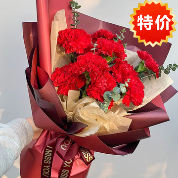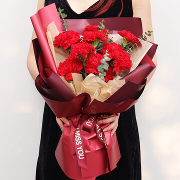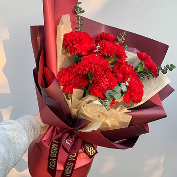 11朵红色康乃馨,尤加利点缀。